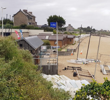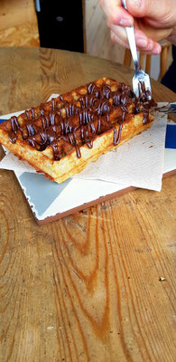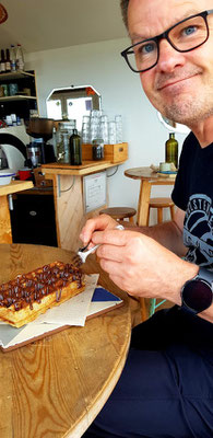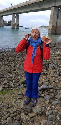 Ich bin immer noch etwas wackelig auf den Füßen, aber das hat uns nicht davon abgehalten, die schöne Gegend zu erkunden. Leider ist das Wetter nicht so toll, aber wir haben uns trotzdem an die wilde Atlantikküste gewagt und den Kite-Surfern zugesehen. Auch der Ort ist wirklich sehr hübsch. Höhepunkt des Tages war jedoch der Besuch der kleinen Strandbar "Les Sardines". Total winzig, aber kultig und mit einer Top- Lage direkt am Meer. Da Matthes ja keine Magenprobleme hat durfte er natürlich die bretonischen Waffeln probieren...