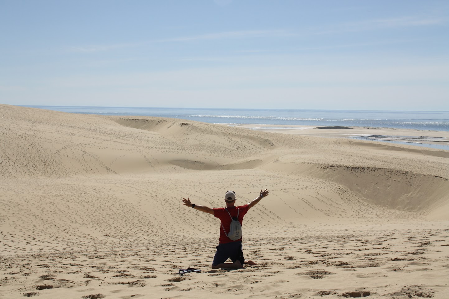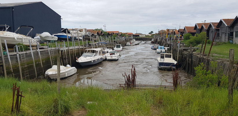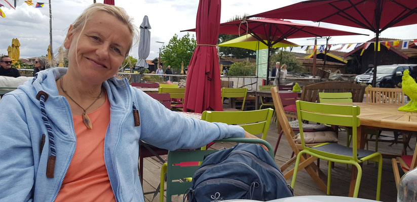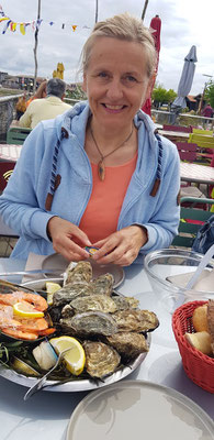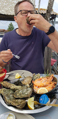 Auf dem Weg von Bordeaux zu unserem nächsten Ziel, der Düne von Pilat, haben wir einen Stopp in der kleinen Hafenstadt Gujan-Mestras eingelegt. Das Hafenstädtchen liegt direkt am Becken von Arachon und zählt zu den bedeutendsten Austern Aufzuchtgebieten in der Region. So konnten wir uns bei einem Bummel durch den Hafen auch nicht gegen die zahlreichen Angebote der Restaurants wehren, Austern für kleines Geld zu probieren. Das heißt, ich schon, aber Matthes wollte diese Delikatesse unbedingt testen. Ich habe mich lieber für Riesengarnelen entschieden. Auch eine gute Wahl. Matthes war von seiner Köstlichkeit aber ebenso begeistert! Und übrigens: Damit man auch Tag und Nacht Austern essen kann gibt es für den Notfall Austern-Automaten...