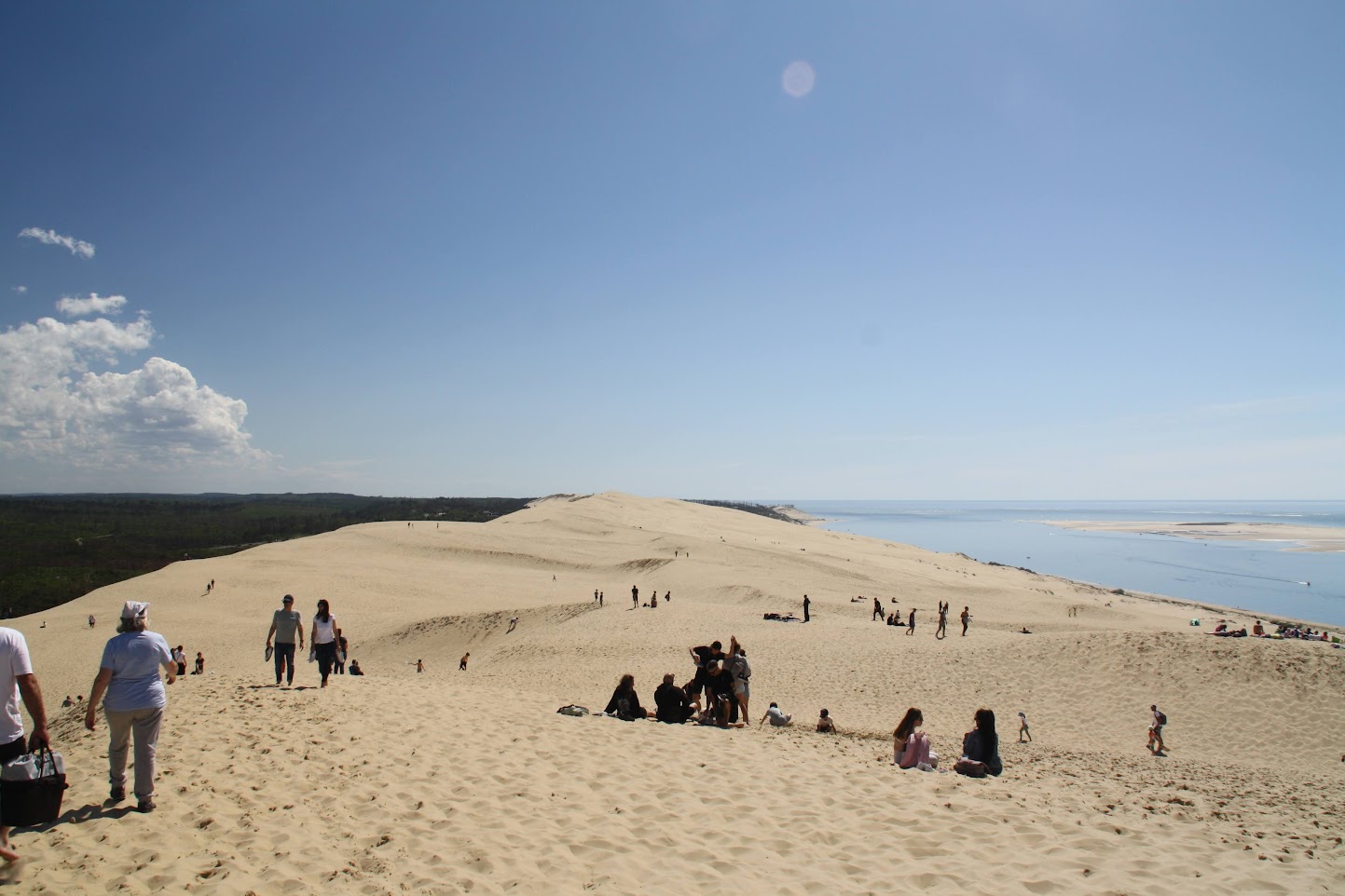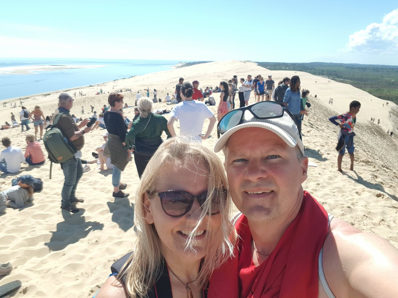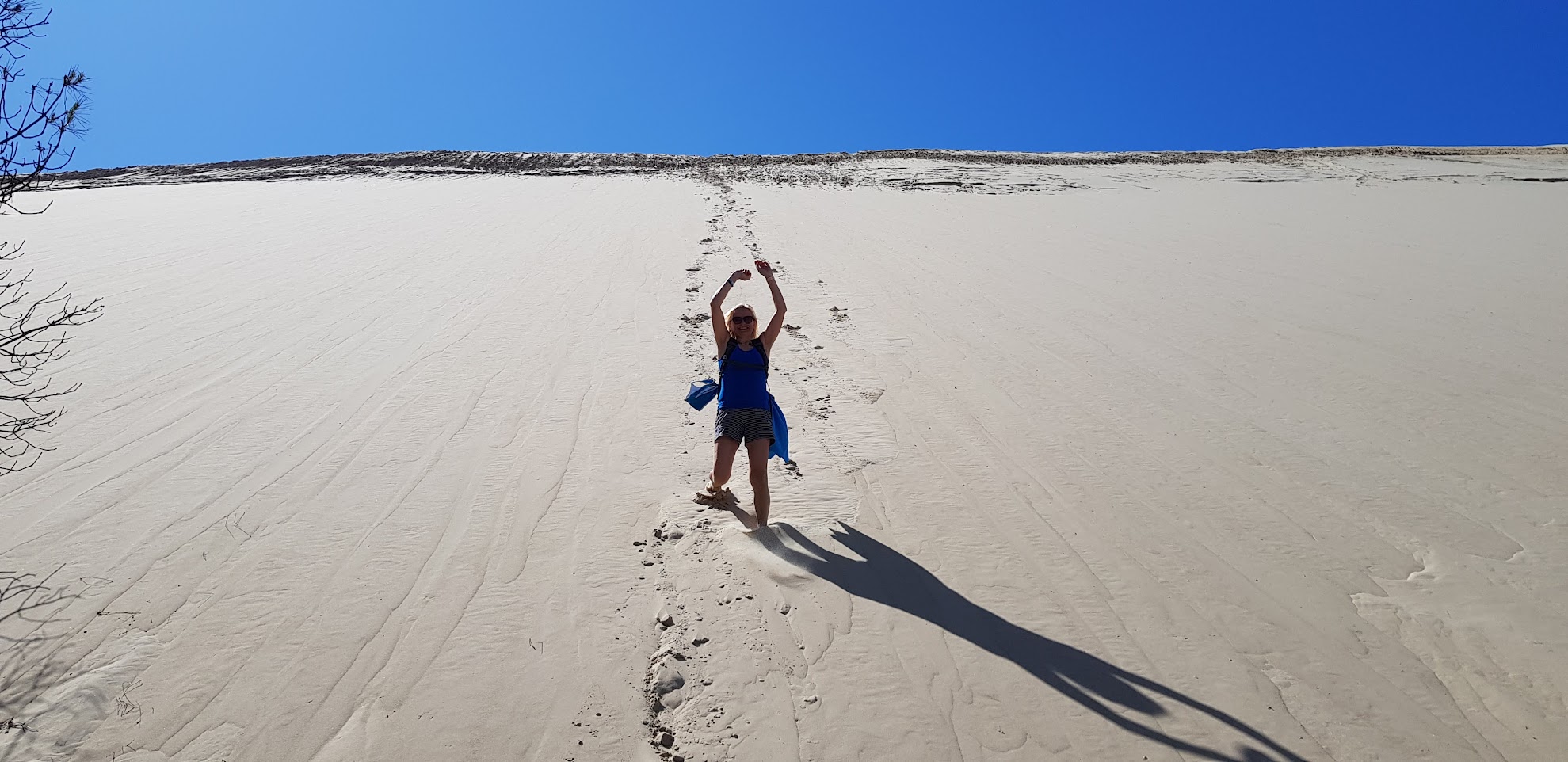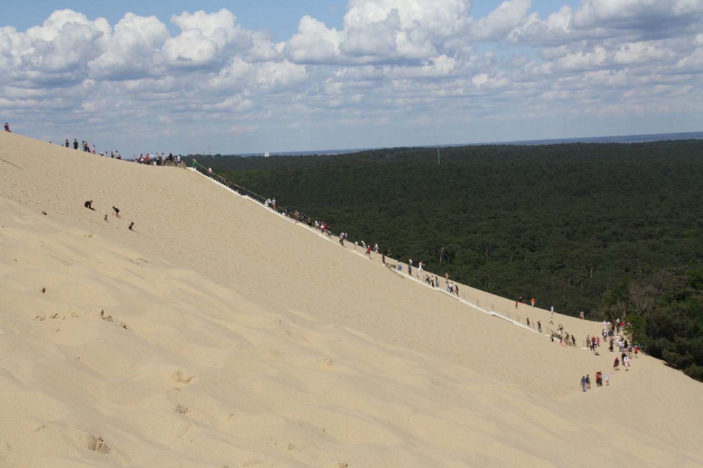Europas höchste Wanderdüne war dann gestern unser nächstes Ziel. Sie ist ca. 2,7 km lang, zwischen 80 und 100m hoch und ca. 500m breit. Es sieht wirklich aus, als ob jemand riesige Sandberge einfach so in die Landschaft gekippt hätte. Unser Campingplatz lag direkt an der Düne. Leider gab es vor 2 Jahren im Waldgebiet vor der Düne einen Waldbrand. Eine riesige Waldfläche sowie 3 Campingplätze sind komplett abgebrannt. Inzwischen wurden die Campingplätze wieder aufgebaut und auch die Vegetation fängt ganz langsam an sich zu erholen. Unser Campingplatz wurde sozusagen mit uns eingeweiht, da wir pünktlich zur Eröffnung dort eintrafen. Allerdings verzögerten sich, wie so häufig, die Bauarbeiten ein wenig. Aber als das Sanitärgebäude kurzzeitig nicht funktionierte konnten wir kulanterweise einfach das Bad in einem nagelneuen Mobilhome nutzen. War also alles erträglich. Am Vormittag haben wir dann den Aufstieg in den "großen Sandhaufen" gewagt. Sehr beeindruckend! Wir sind ca. 2, 5 km am Strand entlang der Düne gewandert und zurück haben wir den Weg über die Düne genommen. Ein gutes Wadentraining - aber schön!