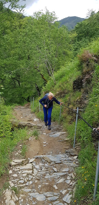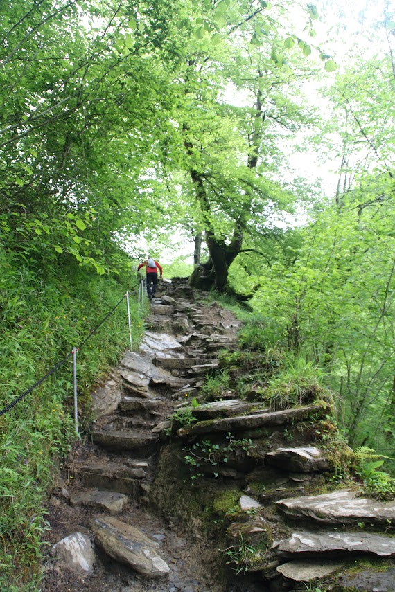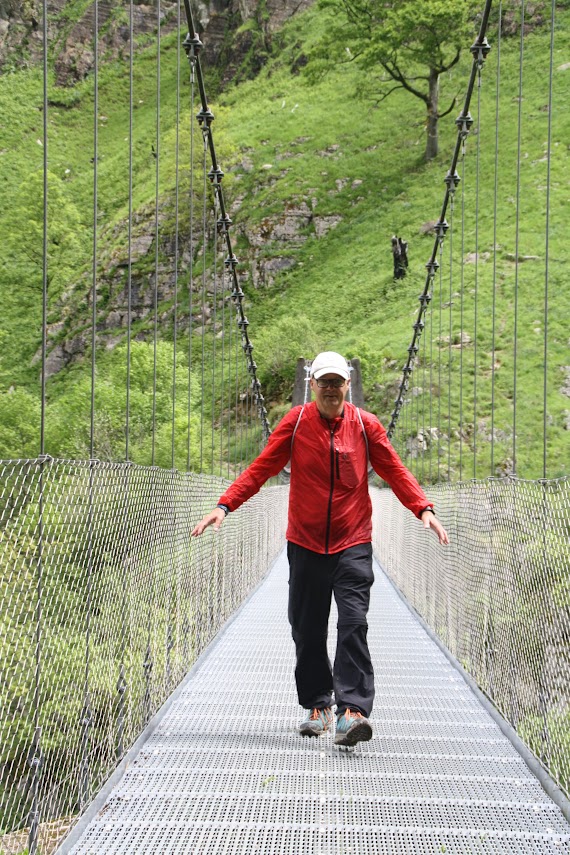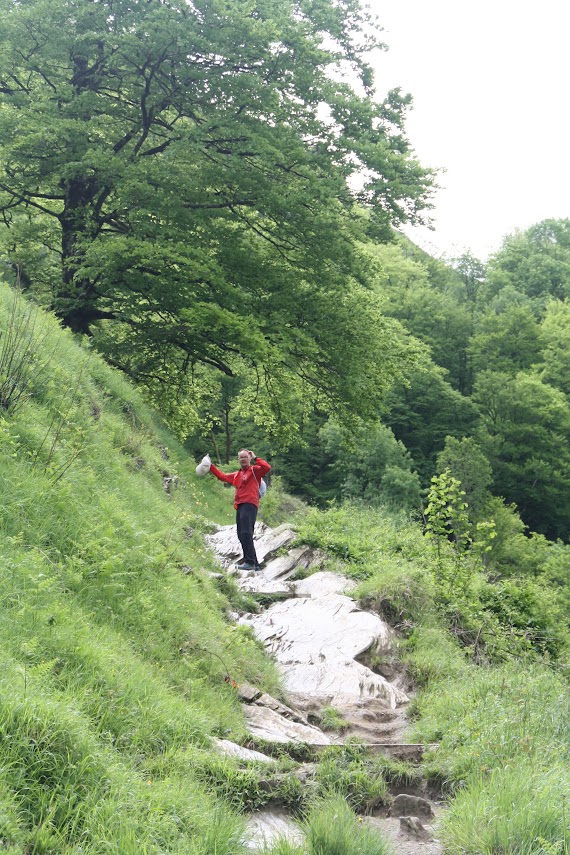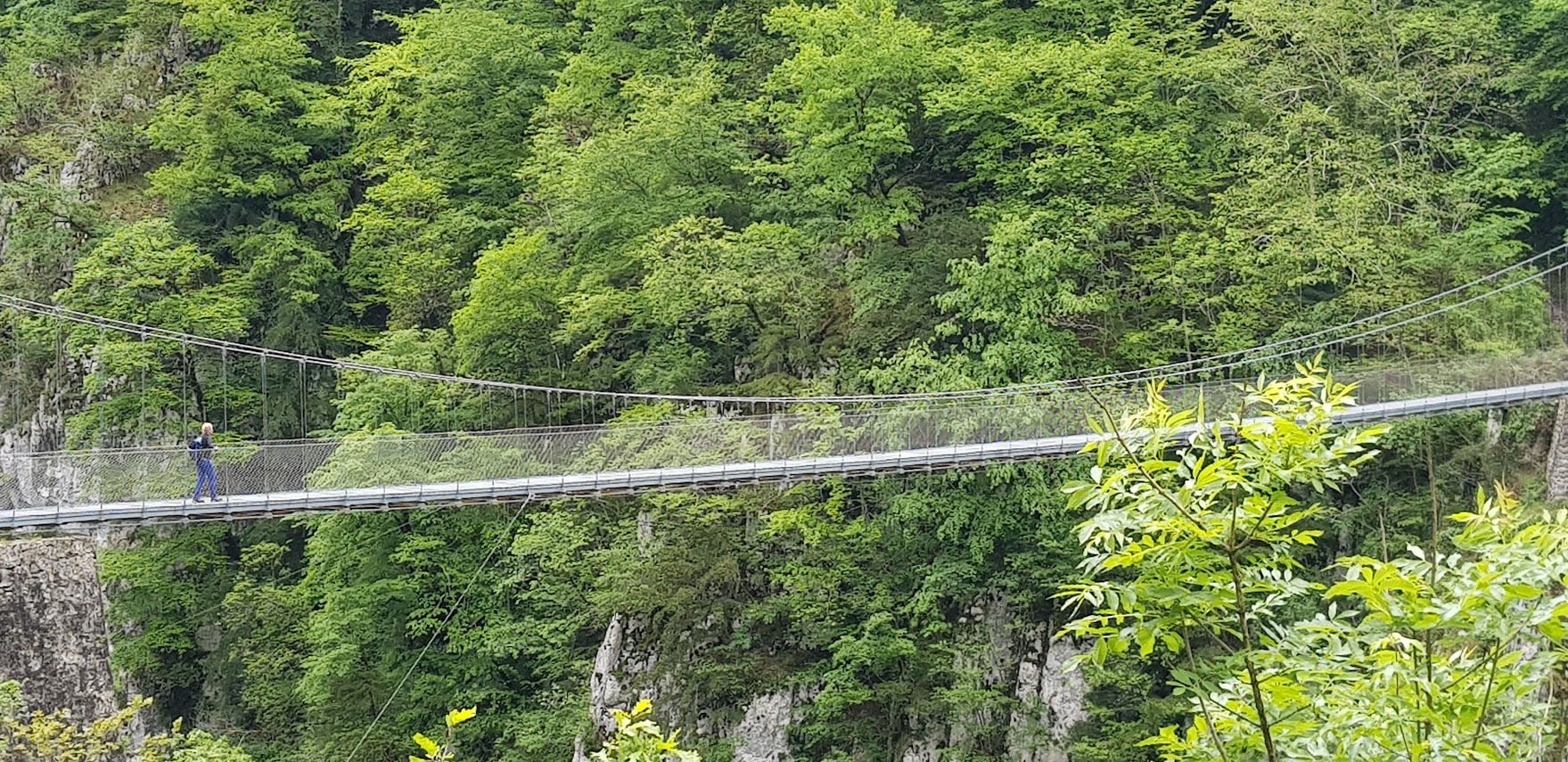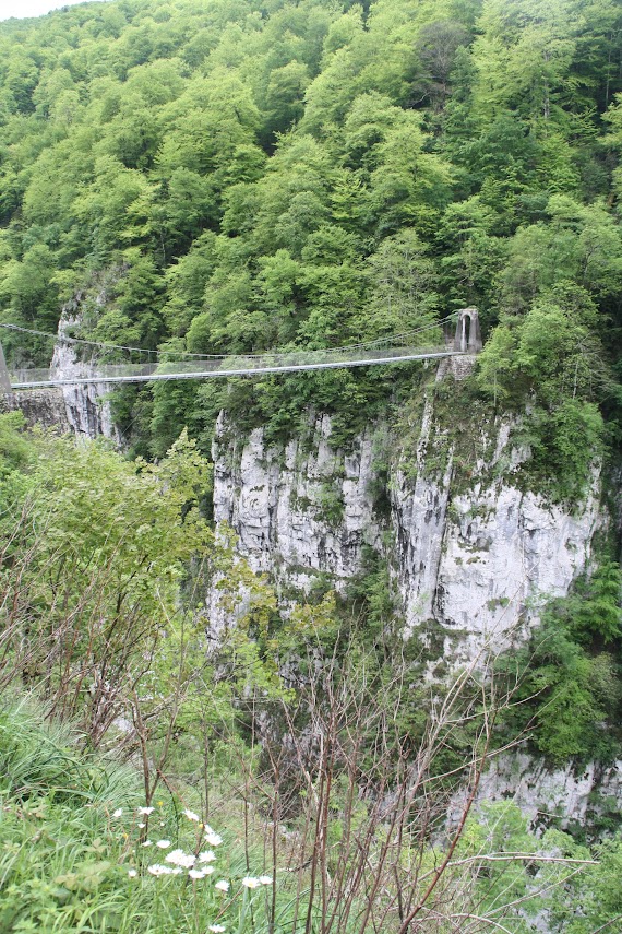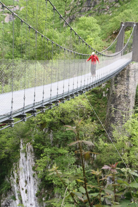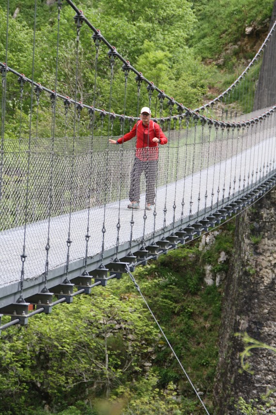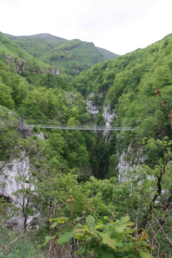 Am nächsten Tag ging es dann auf Wandertour: 20 Kilometer durch wunderschöne Natur. Die Wanderung wurde als schwierig beschrieben, was wir aufgrund unserer bisherigen Wandererfahrungen allerdings nicht so ernst nahmen. Aber sie entpuppte sich tatsächlich als äußerst anspruchsvoll. Der Weg führte zunächst auf einem steilen Anstieg zu einer Hängebrücke, der Holzarte Zubia, die 180 m über eine Schlucht gespannt ist. Dort hinüber zu gehen erforderte tatsächlich Mut, denn beim Betreten der Brücke gerät sie ordentlich ins Wanken. Ich hatte größten Respekt und habe es auch nur geschafft, weil ich weder nach rechts noch links gesehen habe. Auch Matthes verspürte nach eigenen Angaben ein starkes Kribbeln im Bauch und leichtes Unwohlsein. Danach ging es oberhalb des Tals weiter mit wunderschönen Ausblicken und tollen Wasserfällen. Zwischendurch wurden wir leider auch von oben nass, aber der Regen zog schnell wieder vorbei. Nach ca. 6 Stunden erreichten wir wieder unseren Campingplatz. Wir waren ziemlich k.o. und zu allem Übel hatte sich Matthes auch noch eine Blase gelaufen. Aber wozu gibt es Blasenpflaster :) Der Tag war anstrengend, aber wunderschön. Der nochmalige Abstecher nach Frankreich hat sich wirklich gelohnt und das nicht nur wegen des Baguettes!