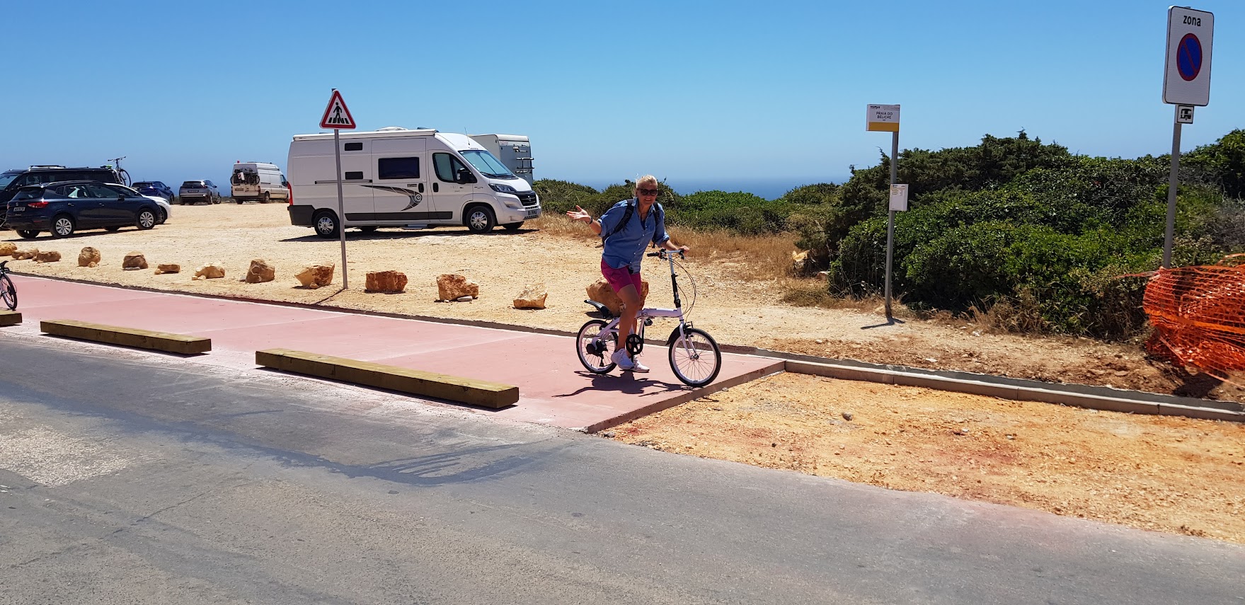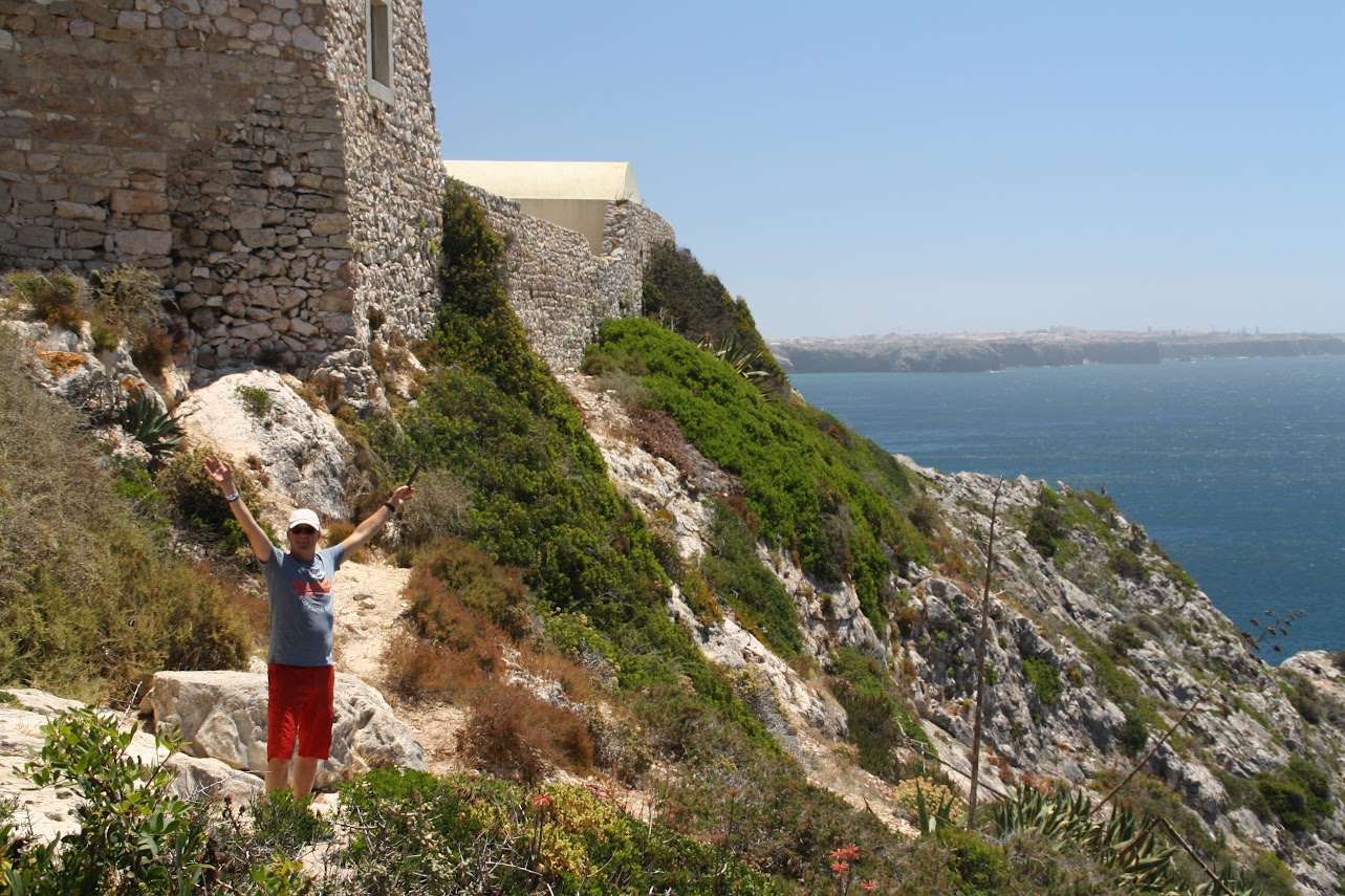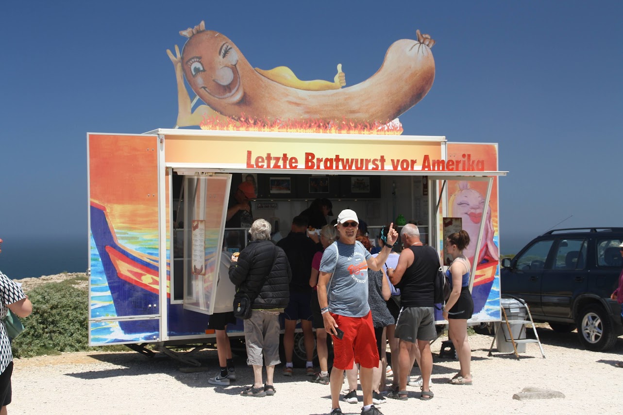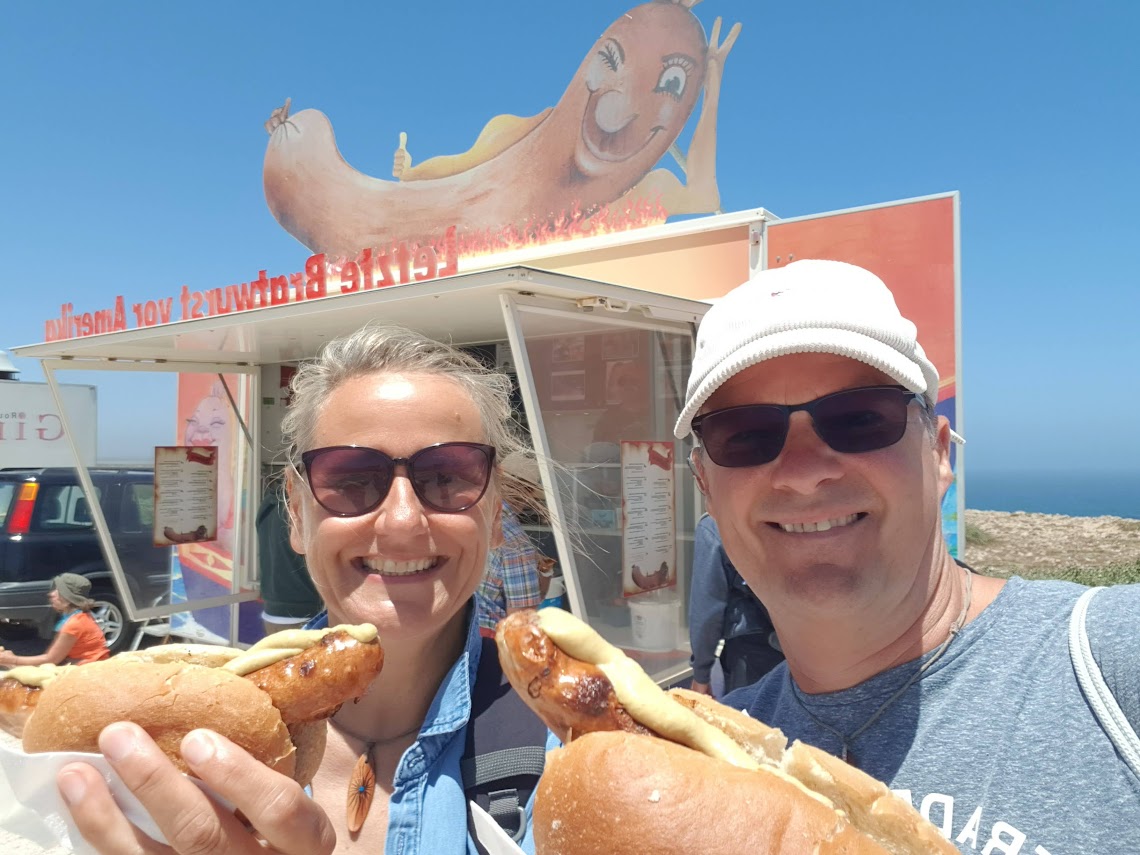 Vegetarier hin oder her - die letzte Bratwurst vor Amerika war für uns ein MUSS, denn wann ist man in Europa dem amerikanischen Kontinent noch einmal so nah. Seit 1996 steht diese Bratwurstbude am Cabo de Sao Vicente, dem südwestlichsten Punkt von Europa. Es gibt dort nicht nur Thüringer Bratwurst mit Bautzener Senf sondern dazu auch noch einen echten norddeutschen Bratwurstverkäufer aus Itzstedt. Das fanden wir sehr lustig. Den Ausflug dorthin haben wir mit unseren Fahrrädern gemacht. Von unserem Campingplatz waren es nur 6,5 km und es gab einen nagelneuen fantastischen Fahrradweg, mit einem klitzekleinen Haken: Der Fahrradweg hörte irgendwann einfach auf und wurde zu einem Schotterweg, das war dann doch zu schwieriges Gelände für unsere kleinen Fahrräder. So mussten wir den Rest des Weges schieben. Trotzdem - ein schöner Ausflug! Vor allem, weil wir auf dem Rückweg noch einen kurzen Fahrradstopp an einem der vielen Strände eingelegt haben. Hier hatte Matthes seinen großen Beach-Auftritt: Nach über acht Wochen bot sich ihm endlich wieder einmal die Möglichkeit, mit vier netten Spanierinnen ein bisschen Volleyball zu spielen. Welch glückliche Fügung! In Sagres selbst hat sich wohl in den letzten Jahren einiges verändert, zumindest meint Matthes das, der vor fast 30 Jahren schon einmal hier war. Es macht den Eindruck, dass die Surfer inzwischen hier die Macht übernommen haben: Hotels sind geschlossen, es gibt nur vereinzelt Restaurants und Kneipen, es gibt keine Bummelmeile und ein richtiges Ortszentrum fehlt. Dafür gibt es viele Surfer Guest Houses und Surfschulen. Die meisten Nicht-Surfer-Leute , wie auch wir, nutzen Sagres eher zur Durchreise. Das war auch stark auf unserem Campingplatz zu spüren, fast niemand blieb dort länger als zwei Nächte.